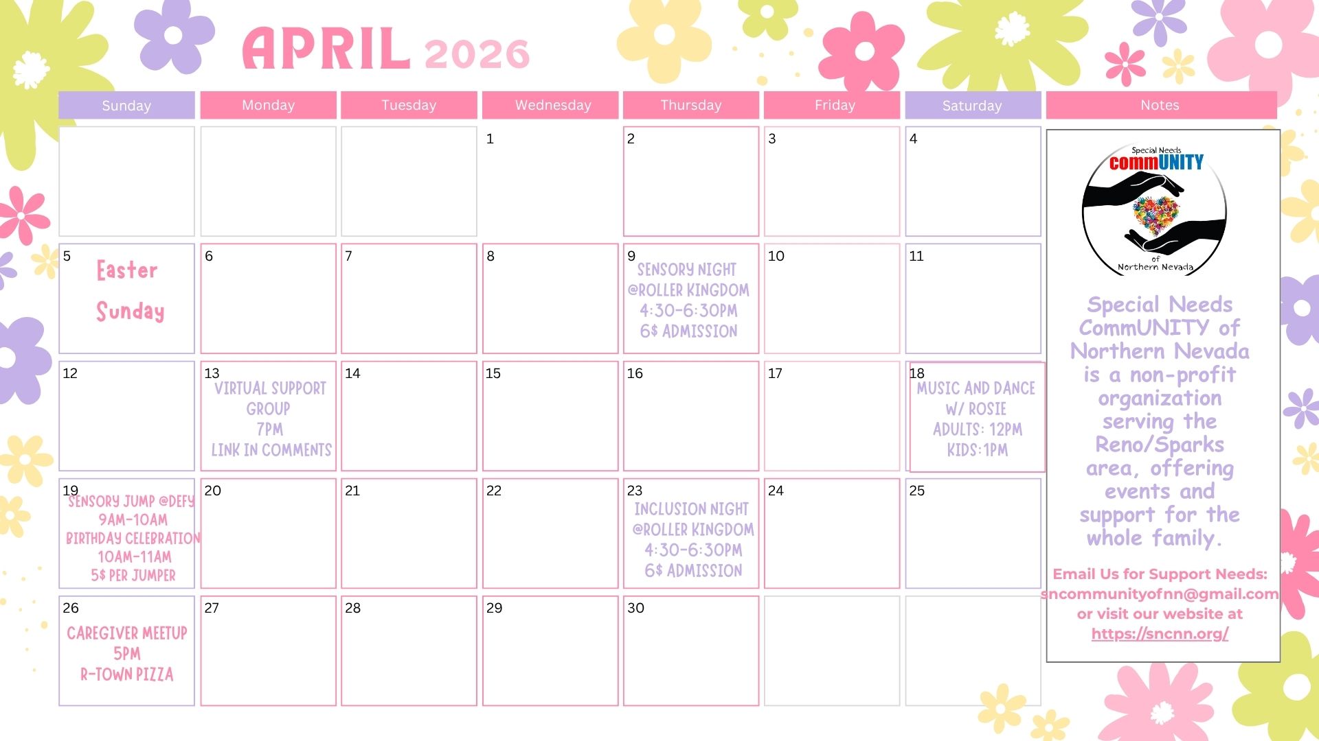 Postponed until further notice. If you have a desire for Support Groups, please contact us at sncommunityofnn@gmail.com or on our FB Private Group (Special Needs CommUNITY of Northern Nevada).